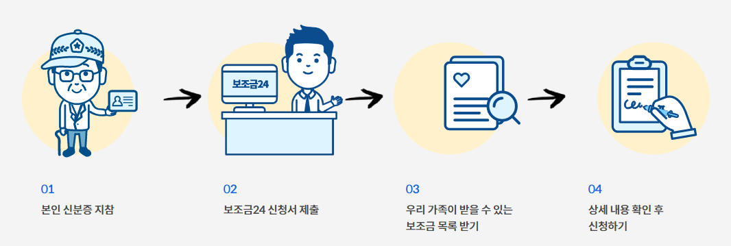 가까운 주민센터를 방문해 보조금24 신청서를 제출하면 우리 가족이 받을 수 있는 보조금을 확인할 수 있습니다.