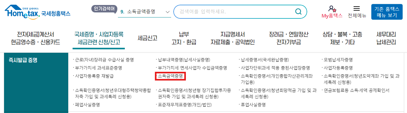1. 아래 [소득금액증명서 발급] 클릭 - 로그인 후 - 국세증명,사업자등록 신청/신고 클릭 - 소득금액증명 클릭